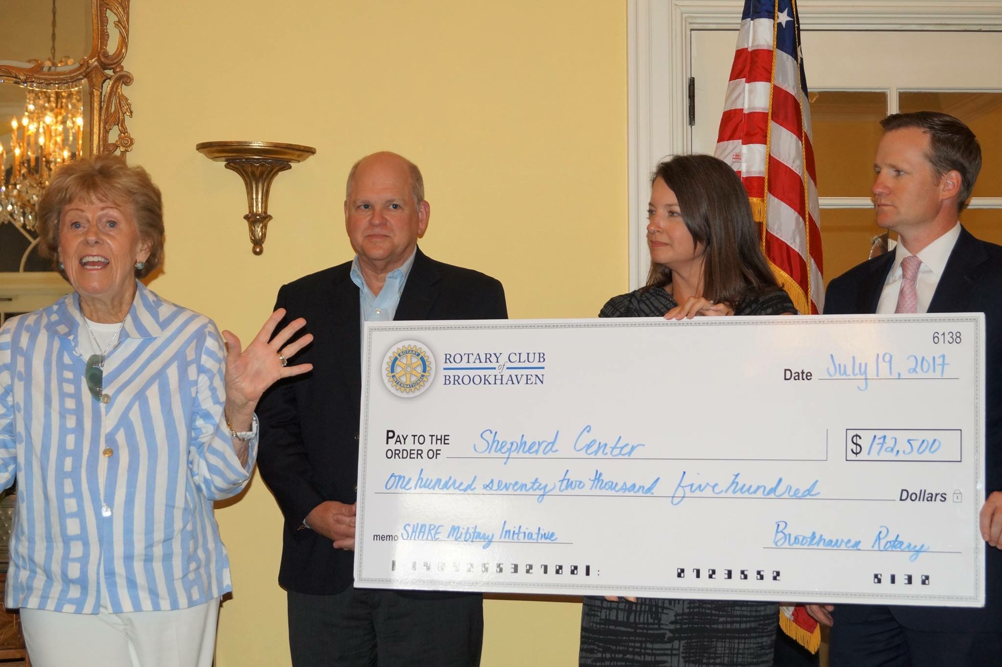 The Rotary Club of Brookhaven, its members, event sponsors and golfers have contributed over $650,000 since 2009 to support Shepherd Center’s SHARE Military Initiative through an annual golf tournament. In 2017 the Club presented Shepherd with a check for $172,500 (see photo below). Our goal is to exceed $250,000 for the May 2018 tournament .