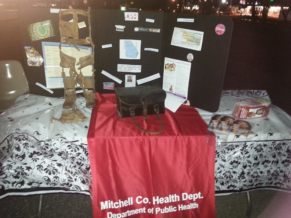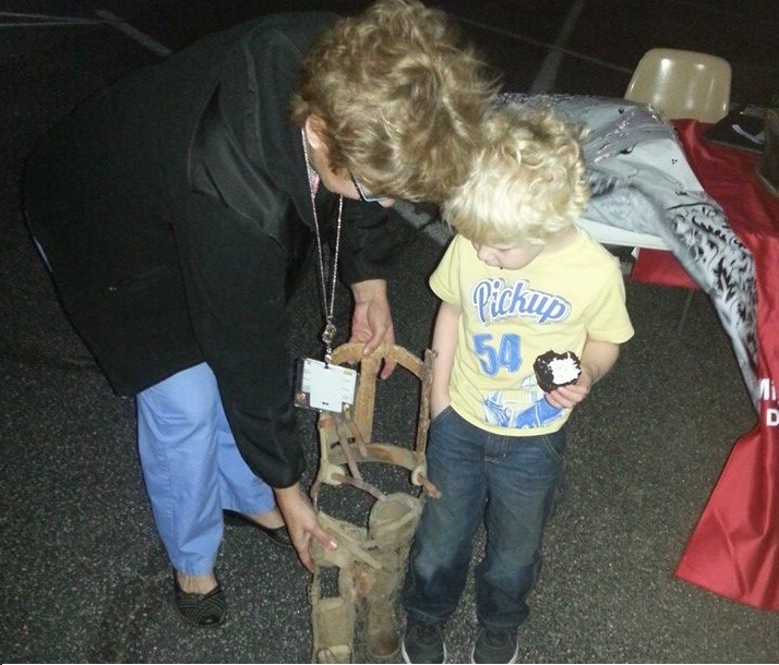 Christi Dixon of the Mitchell County Health Department demonstrates how leg braces were used on children with Polio.