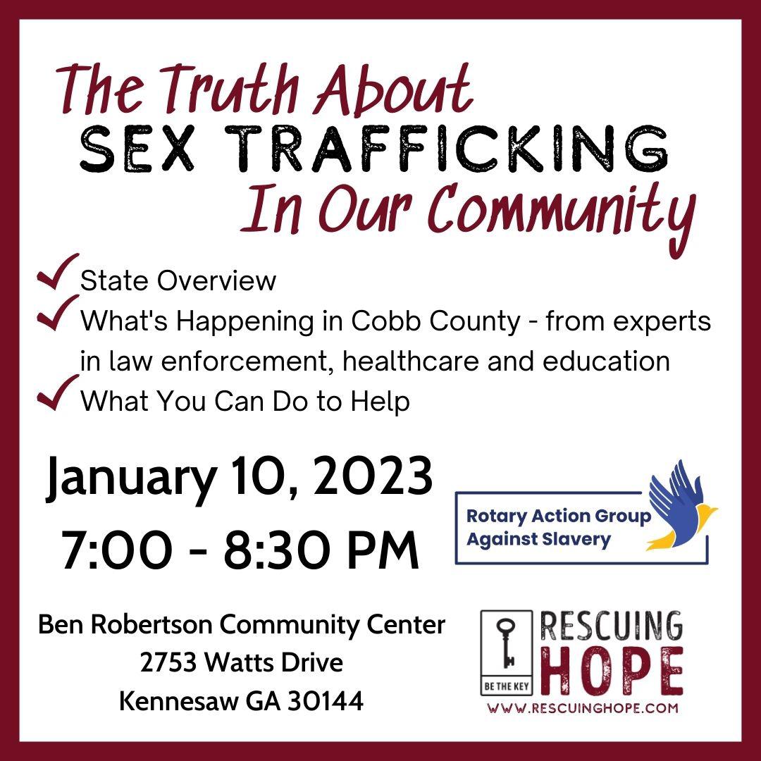 North Cobb Rotary partnered with Rescuing Hope and RAGAS to create a community event including a panel of police chiefs of nearby communities, an ER nurse, Cobb Co. Schools senior Social Worker, and a state prosecuting attorney. Event well attended. Other organizations had tables offering information on the services/support they provide.