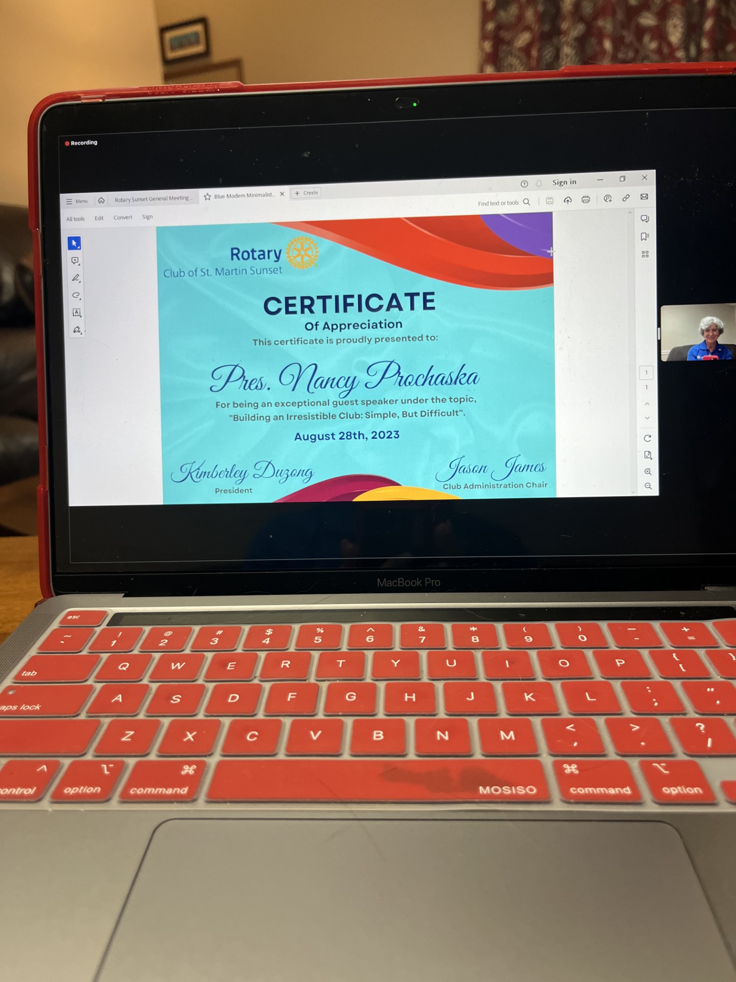 St. Martin's Sunset AG Elisia Lake invited President Nancy Prochaska to be the speaker on zoom for their Aug. 28 meeting. We had 23 St. Martin members on, plus 6 North Cobb members on the zoom call.